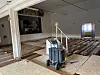 Vegger og gulv i samfunnshuset er fjernet etter en omfattende vannlekkasje. I vinter rant det vann gjennom kjøkkenveggen, videre fosset det mellom sjiktene i gulvet og ned til kjelleren, som var helt dekket med vann: 100.000 liter i vann.Foto: Kine Johnsrud