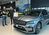 Nybilselger Anders Kristiansen med bileiere nummer 100 av en Skoda Enyaq i Kongsvinger, Ragnar Lukerstuen og Kristina Karlsen.