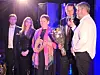 Severin og Linda Aarskog (f.h) får prisen for Innlandets beste 3-åringe varmblods, sammen med eierrepresentanter.