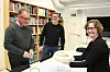 Rektor Øystein Skoglund (t.v.), lærer Sondre Skulstad og FAU-leder Linda Kristin Unumb vil alle beholde Brandval-skolen, og feirer resultatene på nasjonale prøver med kake.