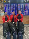 To spente landslagsspillere sammen med en like spent landslagstrener. Her er Jeanette Smedtorp (f.v.), Nina Tomteberget, og Sara Gregersen Hoel klare for avreise på Gardermoen.