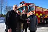 Brannsjef Arnfinn Strømstad er godt fornøyd med å få sin nye tankbil. Her overrekker de tre ordførerne Kamilla Thue (Eidskog), Rune Grenberg (Grue) og Elin Såheim Bjørkli (Kongsvinger) nøklene til den nye bilen tirsdag ettermiddag.