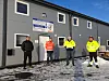 Foran servicebygget på Roverud døgnhvileplass på åpningsdagen. F. v. innehaver av døgnhvileplassen Terje Furuseth, Brandval Bil AS/TF Maskin , Cato Løkken, Statens vegvesen, forbundsleder Tore Velten, NLF, og Lars Rune Hagen, Odal NLF.