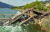 Dronebilder av Tretten bru som går over Gudbrandsdalslågen i Gudbrandsdalen etter at den kollapset i elva og over E6 med en lastebil og en personbil på.