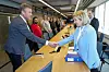 Det blir ingen streik for Fellesforbundets medlemmer i byggebransjen. Bildet er fra starten av meklingen, men også i dag kunne gi hverandre et håndtrykk da Christian Justnes i Fellesforbundet og Siri Bergh fra NHO Byggenæringen kom til en enighet.