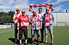 Fra venstre: Magne, Aage, Ronald, og Per Rolf fra seniorgruppa sammen med markedsansvarlig Rune Lundgren iført KIL-skjerf som de nettopp har fått fra OBOS. 400 av de skal deles ut til søndagen.