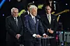 Bjørge Stensbøl (i midten) holdt tale etter at han fikk hedersprisen på Idrettsgallaen. Til venstre prisvinner Hans Trygve Kristiansen og til høyre Mads Kaggestad, sønnen til Johan Kaggestad, som fikk prisen post mortem.