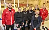Kongsvinger Ishockey har med hele fem jenter på samling for U16-landslaget. Pernille Sørli Løvlie (f.v.) Emma Fladmo, Alma Risberg, Madeleine Østmoløkken og Kajsa Anette Bråten, flankert av trenerne Shawn Taftø (t.v.) og Tommy Fadmo.