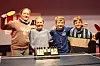 Elevene fra Langeland skole forteller at de koste seg da de tilbrakte mye av torsdagen i Kobrahallen i kamper mot elevene fra Nes. F.v. Emma Mathea Hodøl, Ingrid Holth Løvberg, Mathias Mohn og Embrick Moe Løvberg.