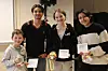 F.v. Daniel Jensen (2. plass), Jan Zepeda, styremedlem i Kongsvinger sjakklubb, Theodor Henriksen (1. plass) og Jia Zepeda (3. plass) er fornøyd med påske-sjakkturneringen.