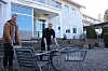 Restaurantansvarlig Martin Martinsen og Snorre Jensen ved Vinger Hotell setter på plass utemøblementet for sesongen.