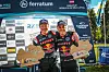 Ole Christian Veiby (t.v.) holdt teamkompis Johan Kristoffersson med selskap på seierspallen under VM-runden i rallycross på søndag.