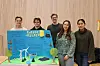 Theo Hole Haglund (16) (f.v.), Ludvik Arnesen Kalland (16), Anja Sophie Hoffmann (16) og Alette Snapa (16) lot folk som svarte riktig på spørsmål om temaet deres kaste krem på dem i maskoten "fløtepus".Foto: Marie Thue Humborstad