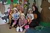 Tuva Emilie Grøndahl på sjiraffen Silje Aasengen sitt fang, Emily Johnsen Tangen (midten) og Nell Åsengen Sletholen på fanget til apekatten Sarah Føien.