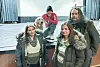 Monica Henriksen (t.v.), Line Andersson og Thomas Ramstad fra styret i Kongsvinger supporterklubb overrakte Rasmus Wold supporterutstyr etter showet. Rasmus hadde med seg sin 11 måneder gamle golden retriever til Kongsvinger.Foto: Pål Sønsteli