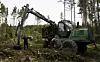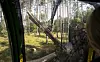 Skogsbilveien slynger seg innover skogen. Veien er lagt med bar fra nedhogga grantrær, og fungerer som et mykt underlag som beskytter skogbunnen mot de tunge maskinene som kjører over den.