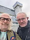 Levi Henriksen kunne ikke si nei da han ble spurt om å skrive bok om Åge Aleksandersen og 21 av hans sanger. Her er de to utenfor Tårnet i Trondheim, hvor Åge har kontor.