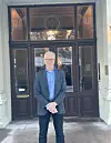 Øyvind Sørensen på trappa til Det Norske Videnskaps-Akademi, Drammensveien 78. – Velkommen inn!